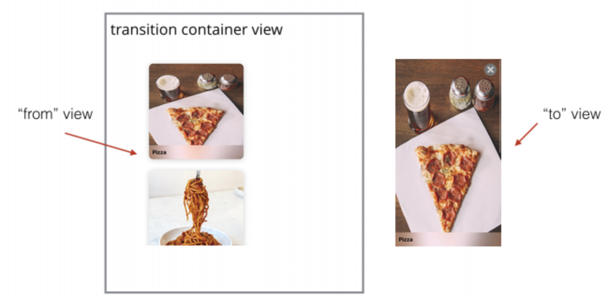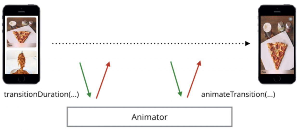 2. 애니메이션이 진행중인 동안, animateTransition(..) 이 호출됩니다. 이 animateTransition(..) 에서는 트랜지션이 진행중인 뷰 -