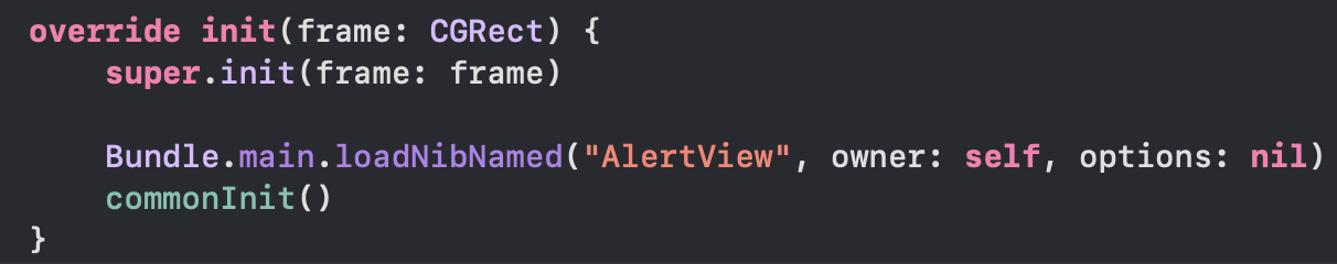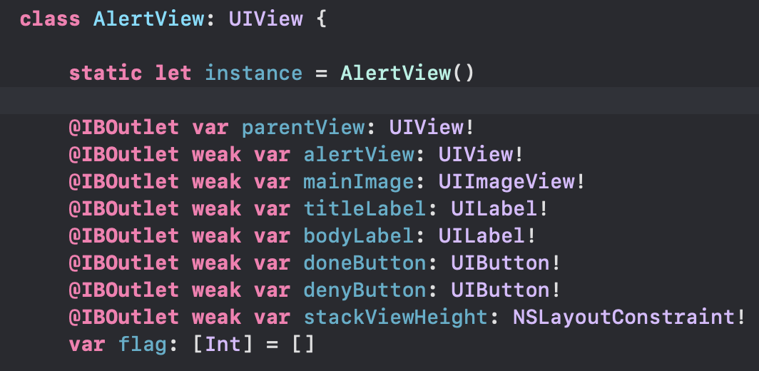 AlertView.swift file에서 Nib을 register하는 과정을 마무리 하면, 두 객체는 잘 연결이 되고 이제 소스코드를 넣으면 됩니다!