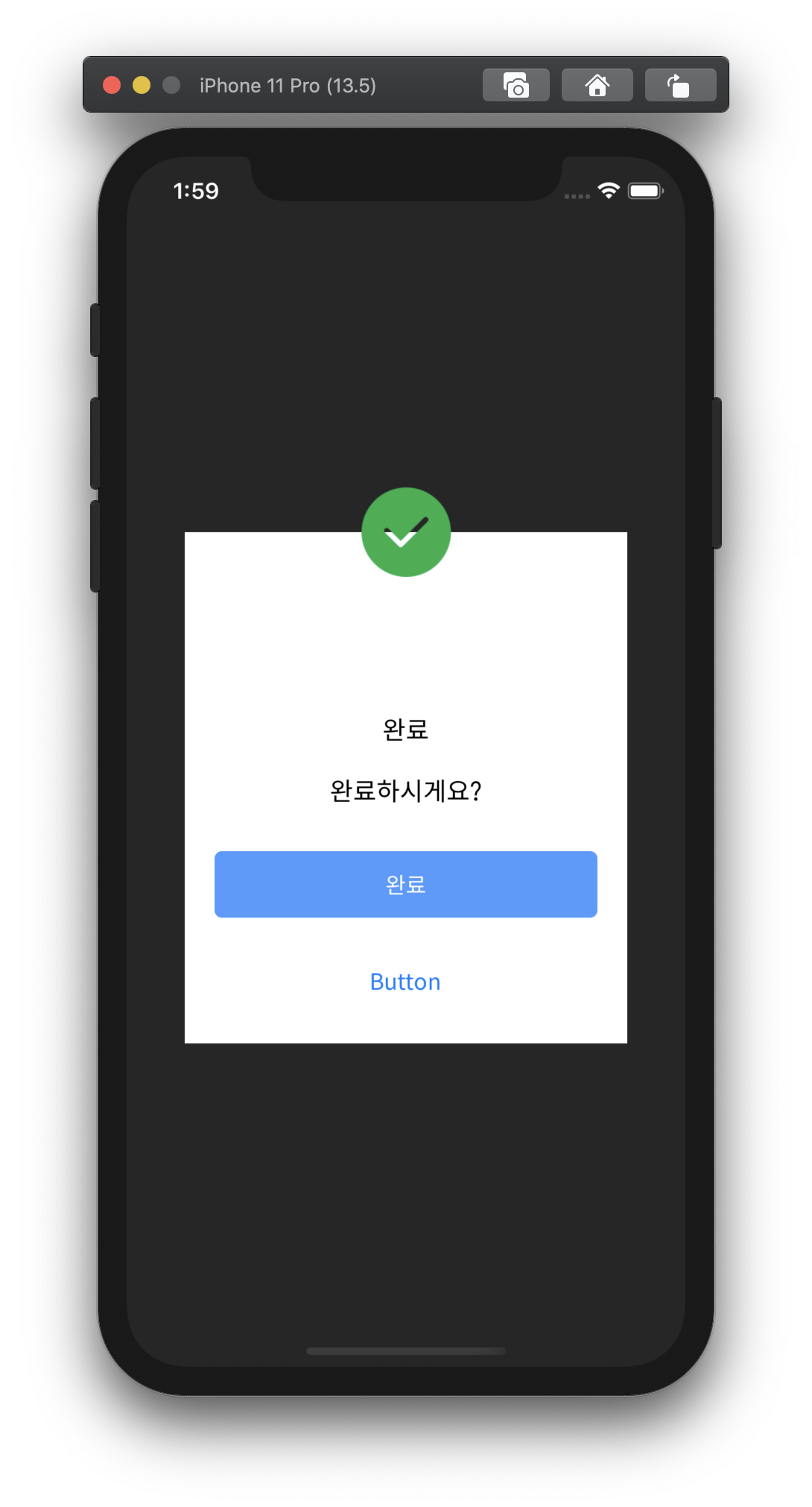 AlertView.instance.showAlert(title: "완료", message: "완료하시게요?", buttonTitle: "완료", alertType: .success)