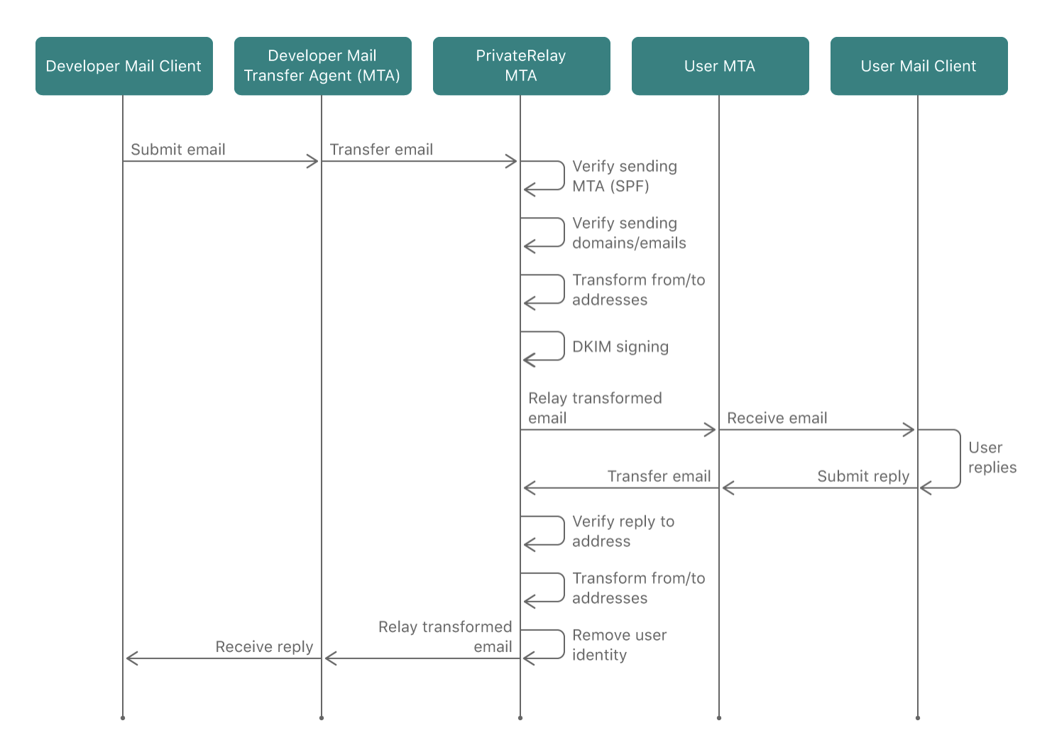 (인증된 DNS) <-------------------------> Apple Email Relaying Service <-------------------------> 사용자