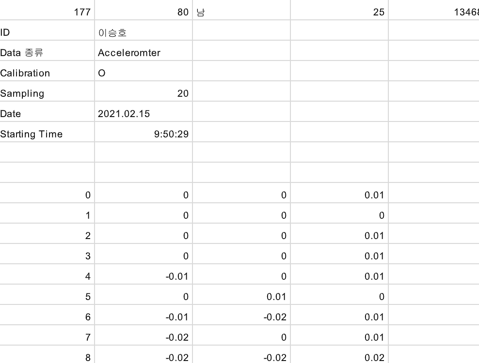 예를 들어 50Hz, 5분마다 저장한다고 하면 한 파일에 가속도는 1만 5천개의 데이터가 정렬이 되어야 합니다.